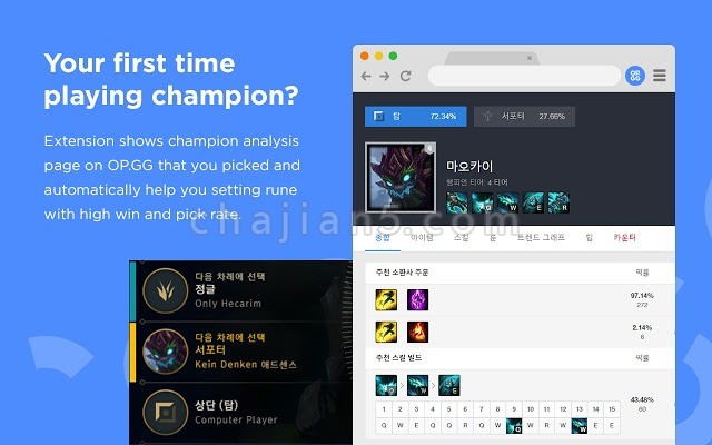OP.GG Extension 是一款可以自动切换符文的扩展。在选择英雄后,浏览器会自动打开该英雄页面,同时,在符文页会有一页名为op.gg的符文页,自动选择op.gg上该英雄的推荐符文。